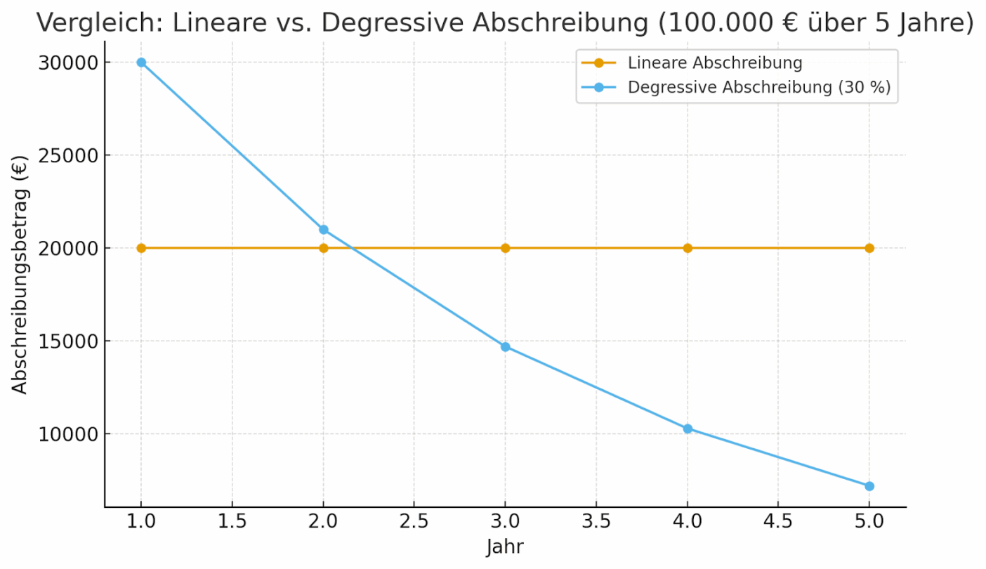 Die Kernwirkung: Durch die degressive Abschreibung sinkt der steuerpflichtige Gewinn früher als mit der linearen Abschreibung. Effektiv wird die Steuerlast in die Zukunft verschoben. Das bedeutet konkret mehr Liquidität für die Unternehmen heute.